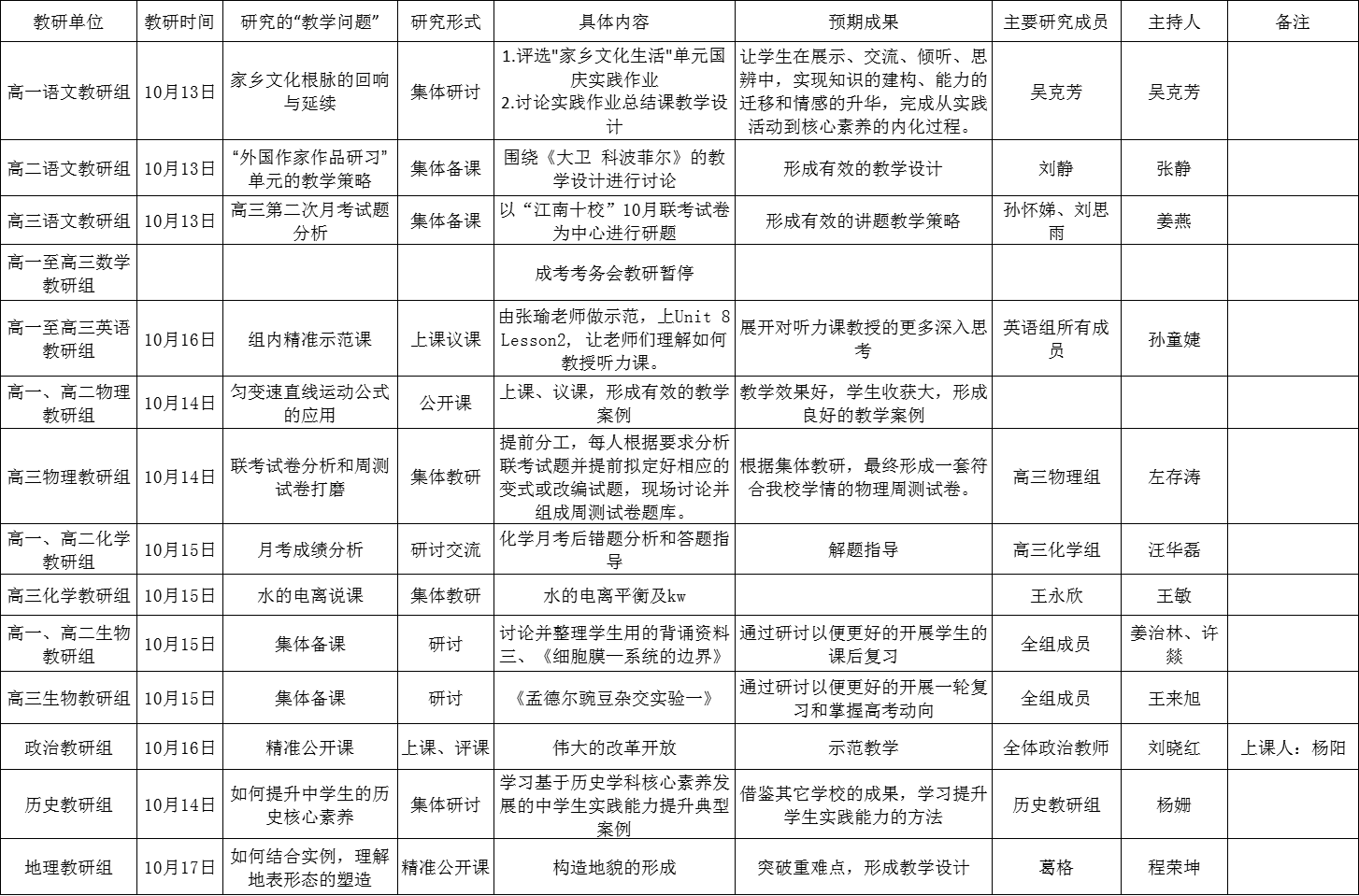 2025-2026学年度第一学期第7周(10.13-10.17)各学科组教研活动计划汇总表