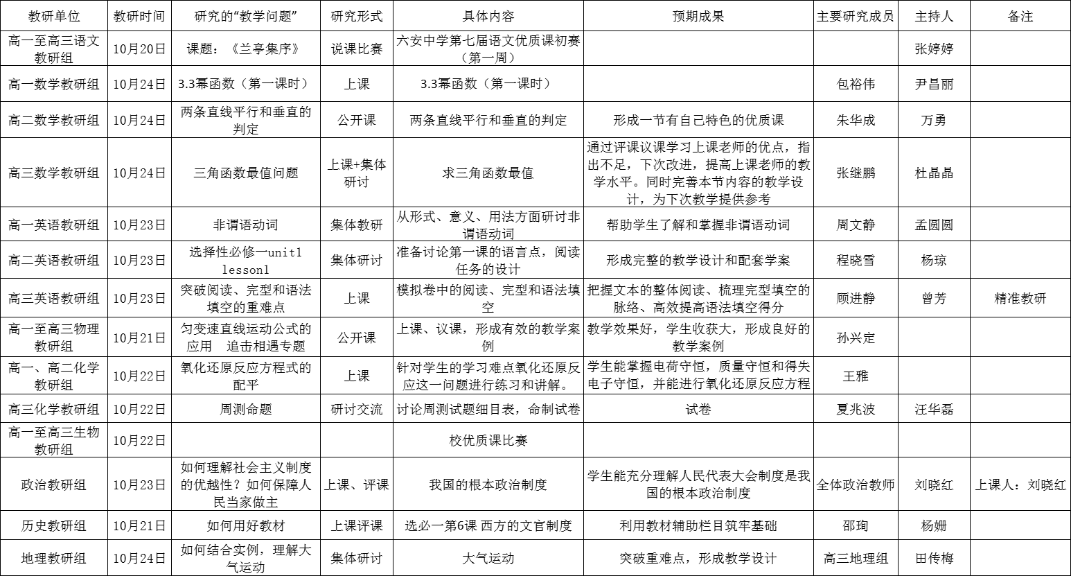 2025-2026学年度第一学期第8周(10.20-10.24)各学科组教研活动计划汇总表